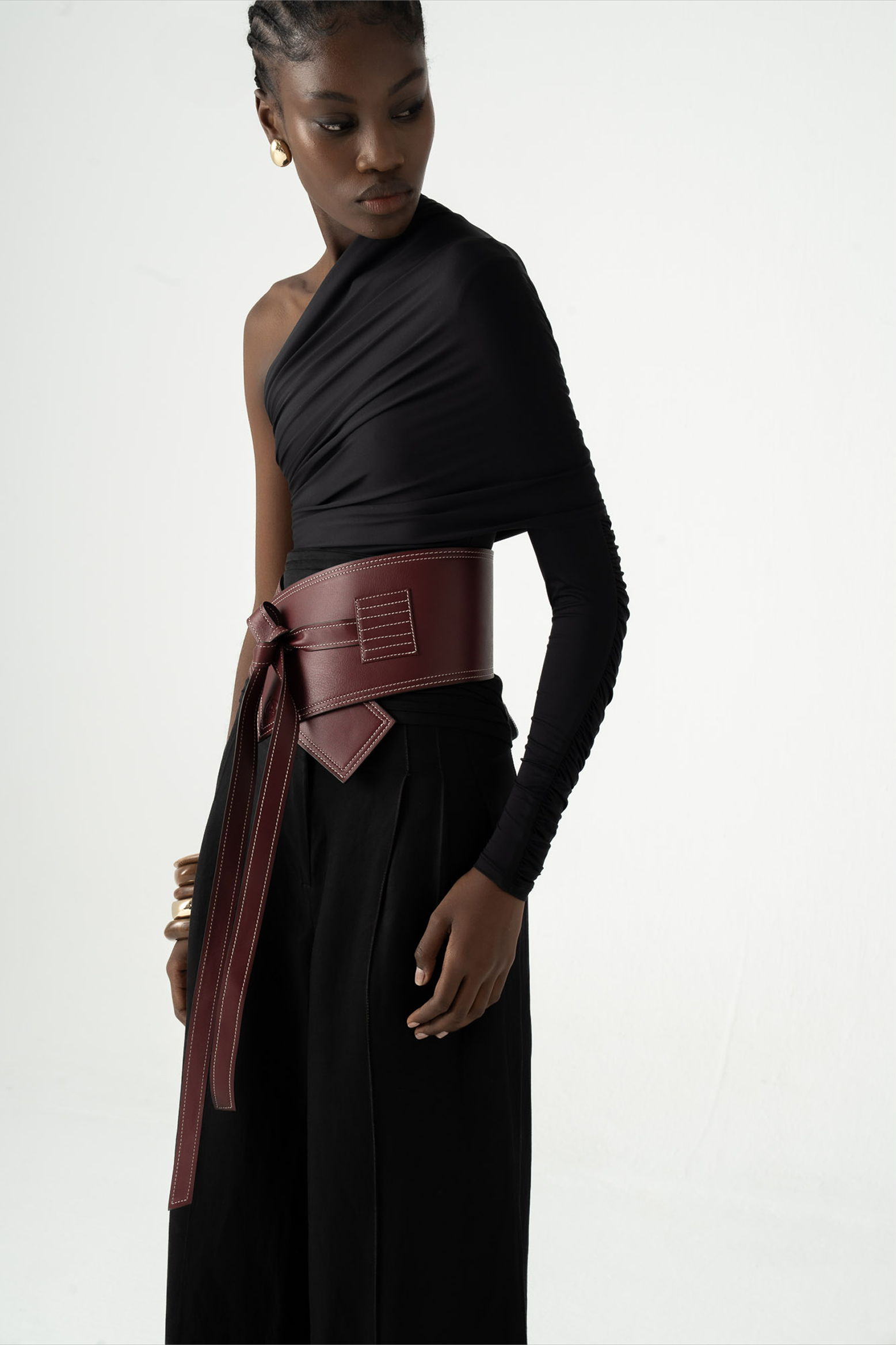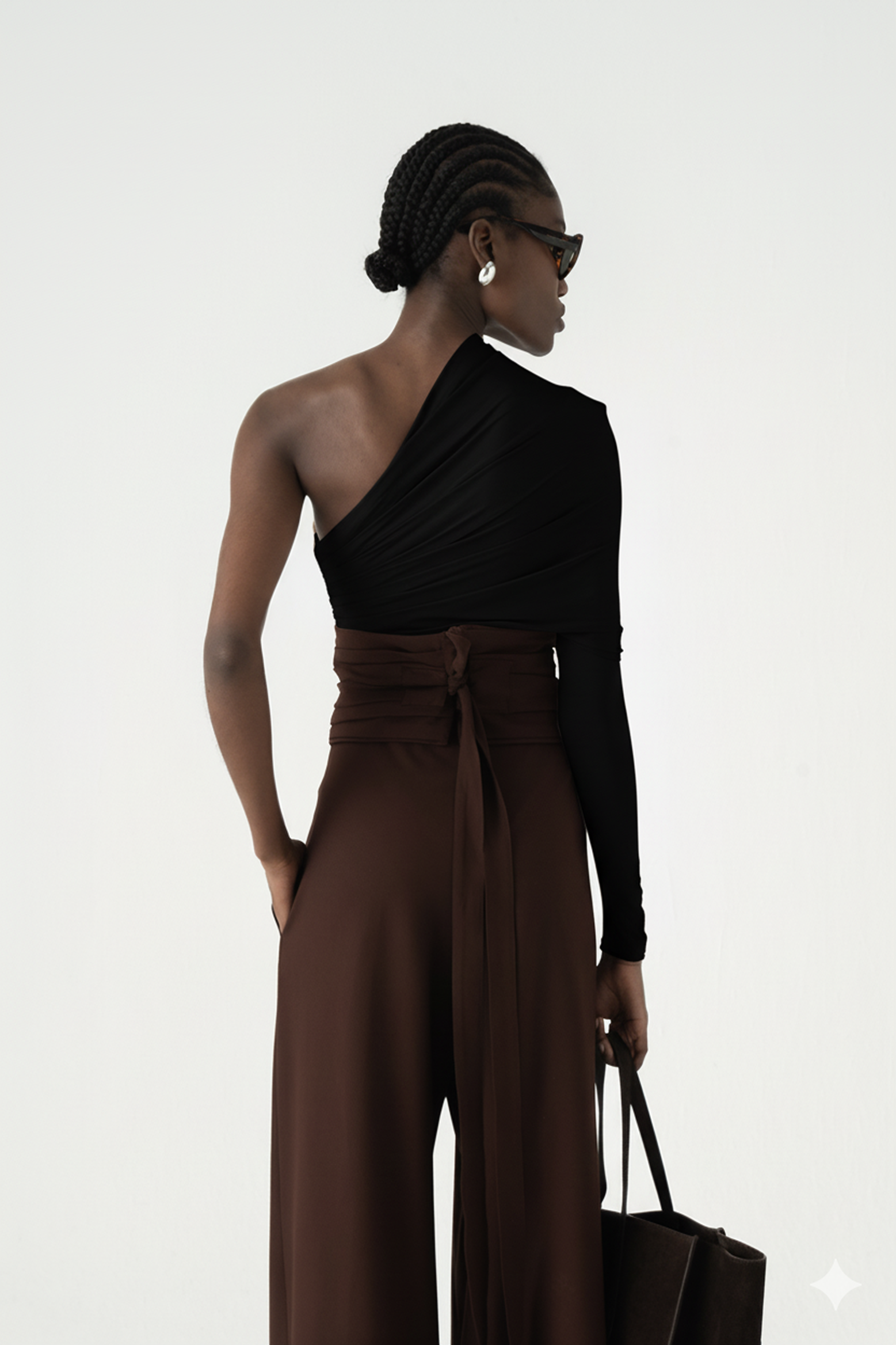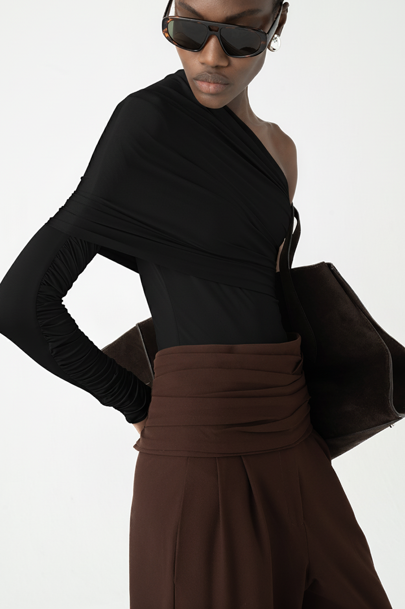 La Chispa Body de manga larga drapeada, con panel drapeado en un solo hombro. Diseño ceñido al cuerpo, resaltando la silueta.